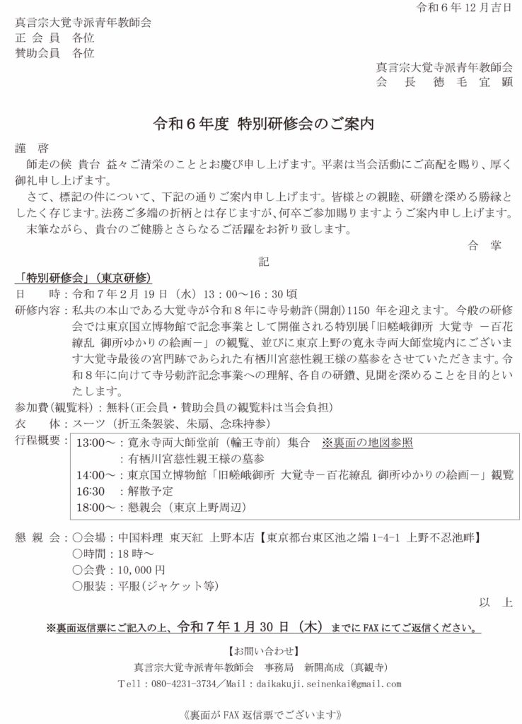 私共の本山である大覚寺が令和8年に寺号勅許(開創)1150 年を迎えます。今般の研修会では東京国立博物館で記念事業として開催される特別展「旧嵯峨御所 大覚寺 -百花 繚乱 御所ゆかりの絵画-」の観覧、並びに東京上野の寛永寺両大師堂境内にございます大覚寺最後の宮門跡であられた有栖川宮慈性親王様の墓参をさせていただきます。令和8年に向けて寺号勅許記念事業への理解、各自の研鑽、見聞を深めることを目的といたします。