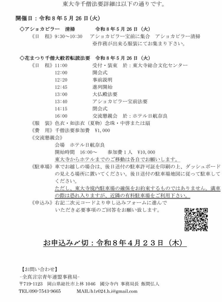 5月26日、奈良 東大寺の毘盧遮那仏さまの宝前にて全国の仏教青年僧と「世界平和と全ての方々の幸せ」を祈りませんか。