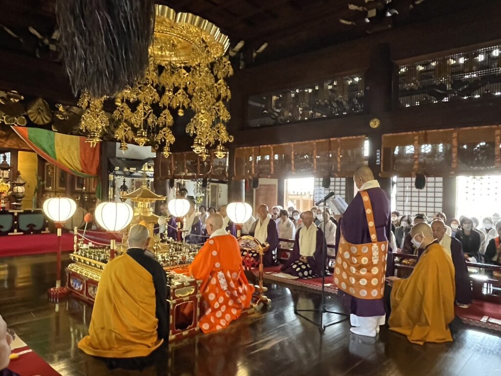 前日より荘厳準備、習礼を行い、翌日の本番では一同に弘法大師様の御誕生を祝し、奉献華法会を勤修させていただきました。法会後は、弘法大師御生1250年記念特別参拝として御影堂秘仏本尊・瞬目大師像特別御開帳をはじめ総本山善通寺様における宝物を拝観させていただき大変感銘を受けました。